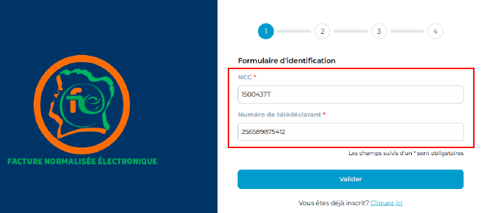 Etape 2 : renseigner le formulaire d'identification en mentionnant votre Numéro de Compte Contribuable (NCC) et votre Numéro de Télédéclarant (NTD).