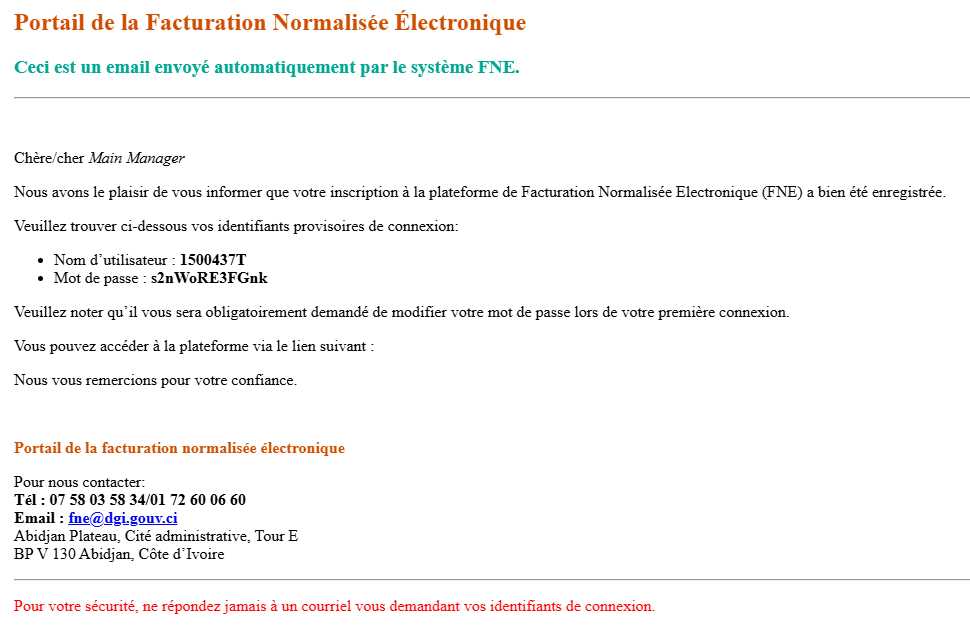 Ce mail comporte le nom d’utilisateur et le mot de passe à utiliser pour votre première